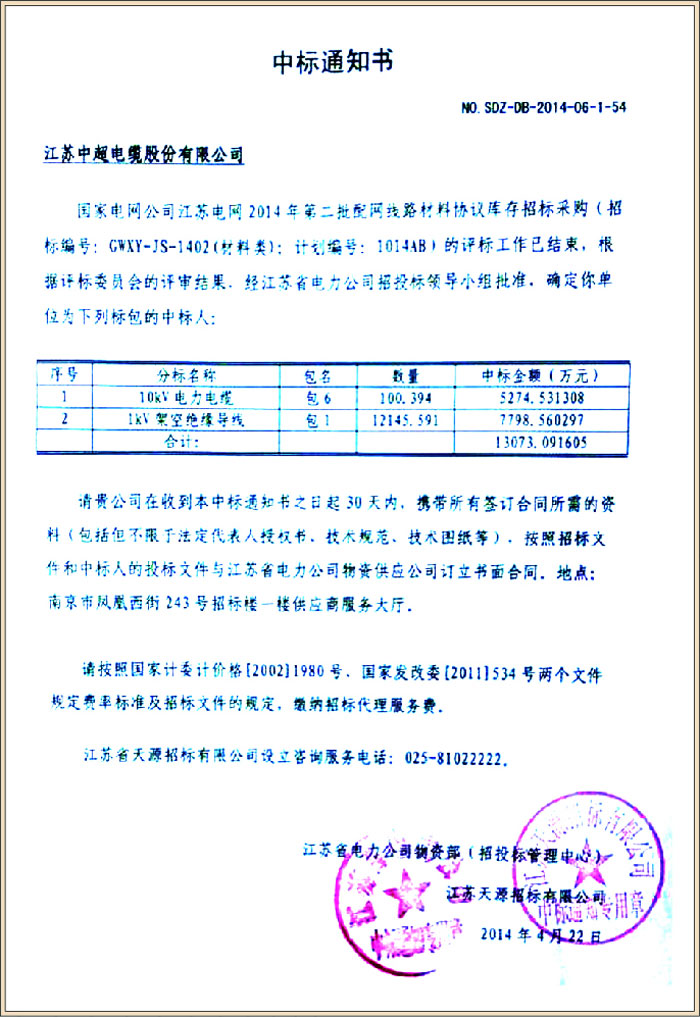 国家电网公司江苏电网2014年第二批配网线路材料协议库存招标采购(中标号SDZ-DB-2014-06-1-54)