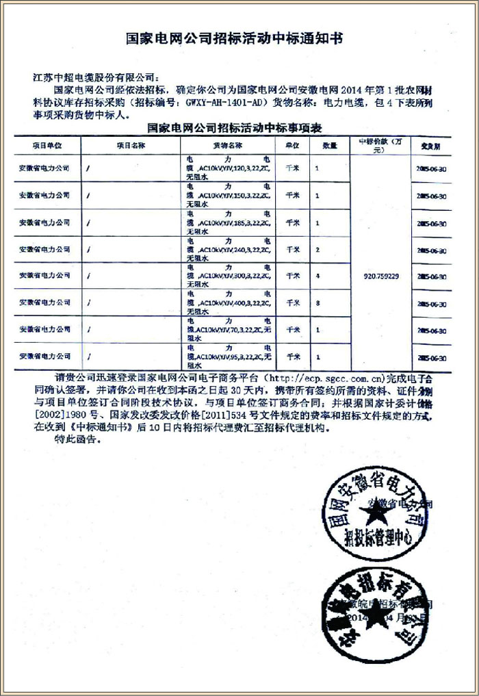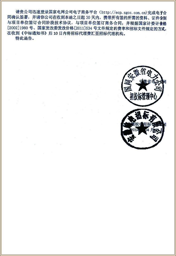 国家电网公司安徽电网2014年第1批农网线路材料协议库存招标采购(中标号GWXY-AH-1401-AD)