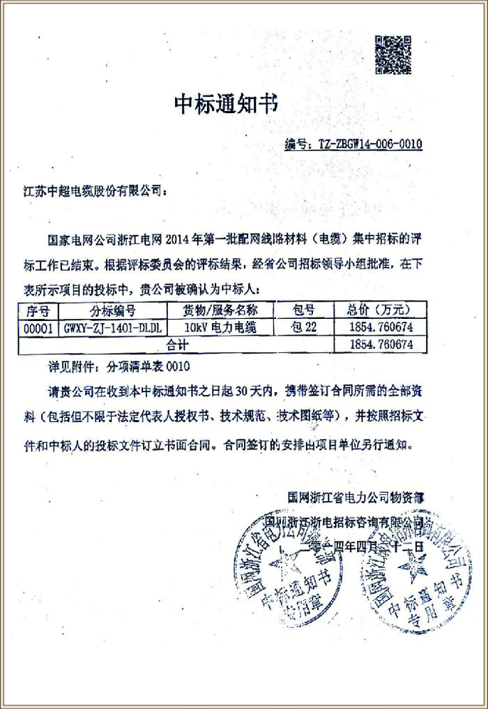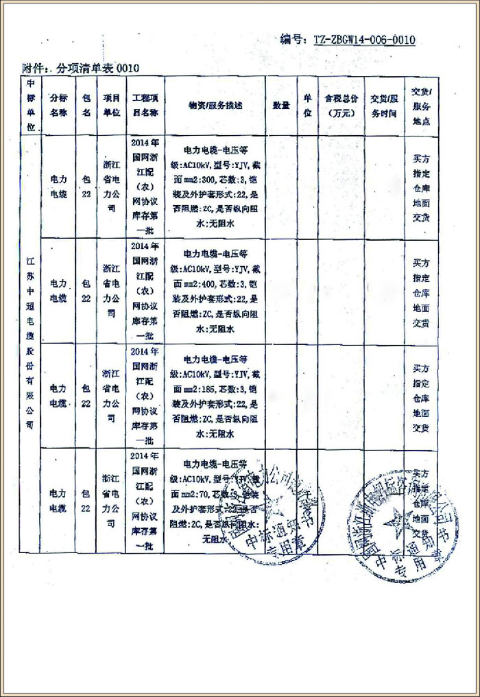 国家电网公司浙江电网2014年第一批配网线路材料(电缆)集中招标项目(中标号TZ-ZBGW14-006-0010)