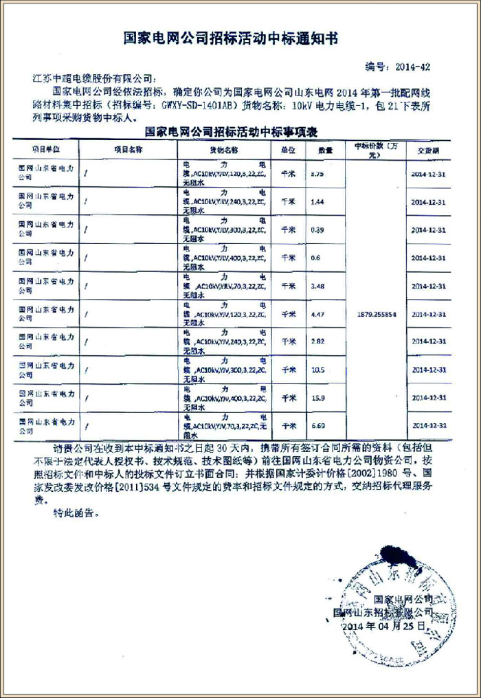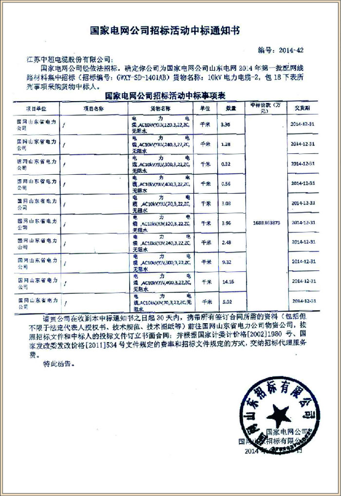 国家电网公司山东电网2014年第一批配网线路材料集中招标项目(中标号GWXY-SD-1401AB)
