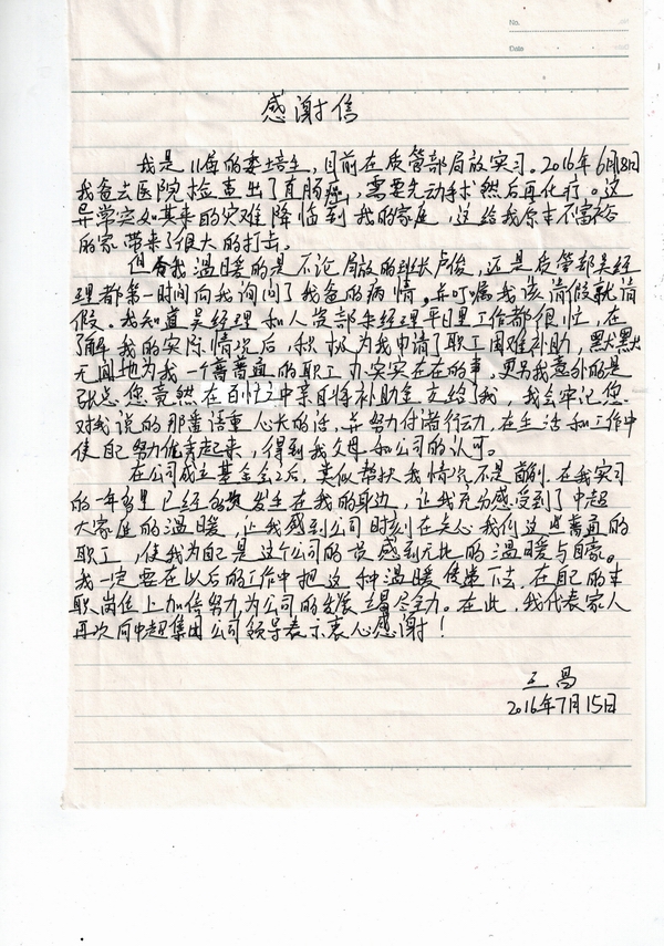 2016年6月,公司员工王昌的父亲被确诊为癌症,突如其来的变故让家人无法接受,高额的治疗费用更是压垮了这个本不富裕的家庭。为了治病,王昌的父亲多次住进医院,并急需接受手术。公司领导获悉此事后,立即发动全体员工为王昌的父亲捐款,无论是朝夕相处的同事,还是素未谋面的员工,都纷纷伸出援助之手,积极为王昌献出自己的一份爱心。与此同时,中超慈善基金会也为王昌送来了救助款,中超控股总经理张乃明亲自将款项交到王昌手中,并鼓励他树立战胜困难的信心,承担起家庭重任,做好本职工作,以优异的工作业绩回报公司的关心、同事的关爱。王昌收到爱心款后感动万分,向公司和同事们致以由衷的感谢,并表示用一流的工作成绩感恩、回报公司。
