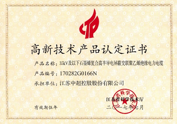 > 201707 35kV及以下石墨烯复合高半导电屏蔽交联聚乙烯绝缘电力电缆——高新技术产品认定证书