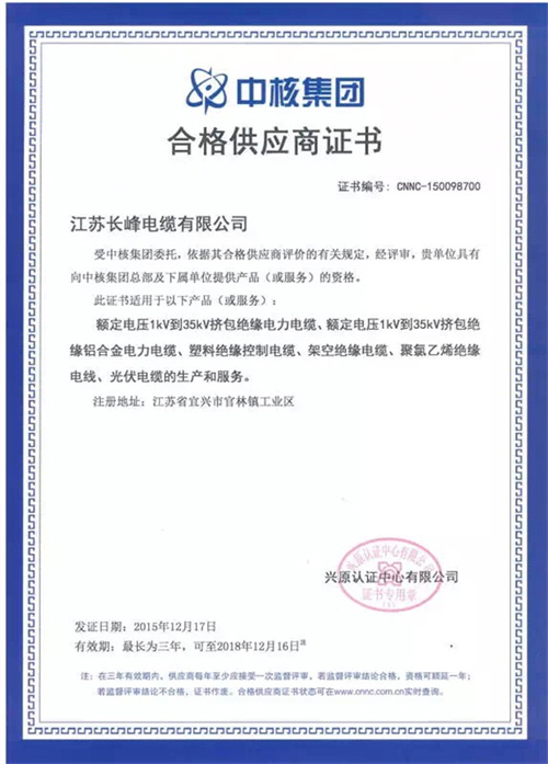 近日,中超控股子公司江苏长峰电缆有限公司收到了中核集团合格供应商证书,标志着长峰电缆入围中核集团合格供应商行列,具备向中核集团总部及下属单位提供产品(或服务)的资格。