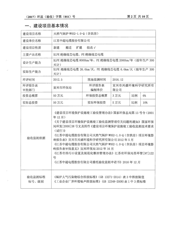 中超电缆于2017年1月18日顺利通过天然气锅炉项目“三同时”验收监测,现公示具体的《监测报告》!