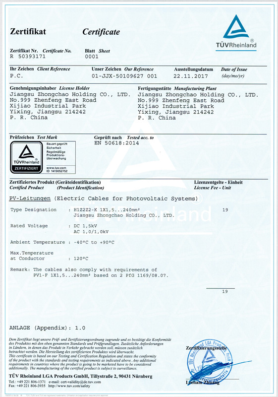 日前,公司自主研发的H1Z2Z2-K及PV1-F系列1.5---240mm2光伏电缆通过了德国莱茵公司TÜV认证。德国莱茵TÜV集团是世界最有影响力的认证机构之一,作为全球光伏组件测试服务的领先者,在光伏产品检测和认证领域已经拥有极高的声誉,所颁布的TÜV证书在市场上受到广泛的认可。