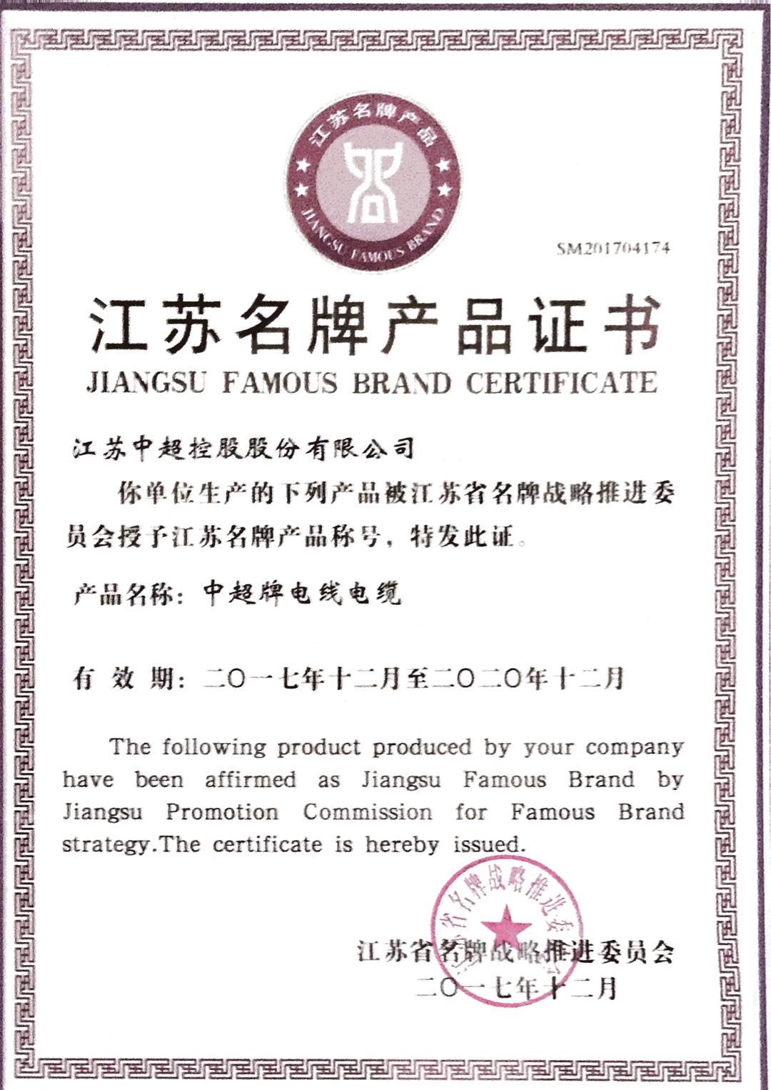 近日,公司“中超牌电线电缆”产品再次通过江苏省名牌战略推进委员会评审,荣获“江苏名牌产品证书”。